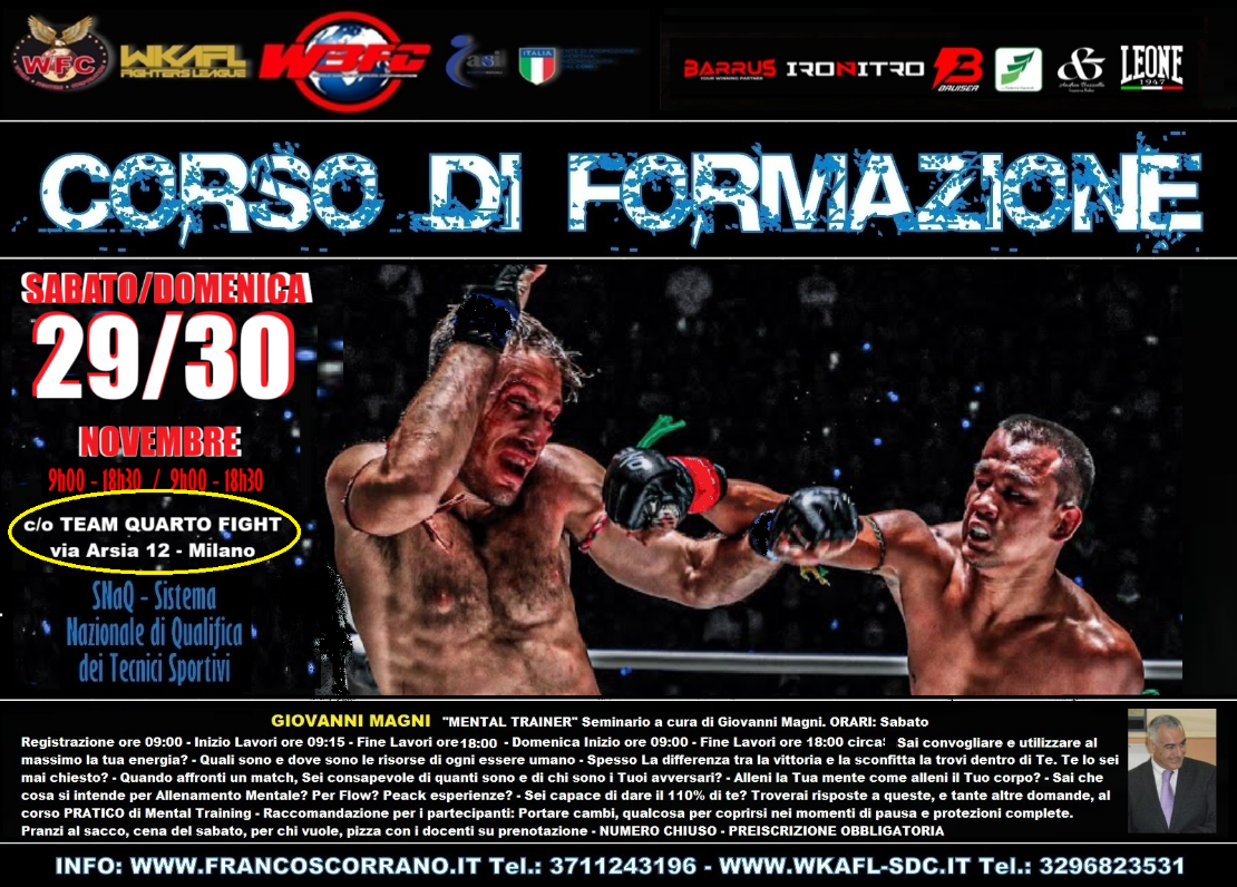 SABATO 29 NOVEMBRE e DOMENICA 30 NOVEMBRE: "MENTAL TRAINER" Seminario a cura di Giovanni Magni. ORARI: Sabato Registrazione ore 09:00 - Inizio Lavori ore 09:15 - Fine Lavori ore 20:30 - Domenica Inizio ore 09:00 - Fine Lavori ore 18:00 circaSai convogliare e utilizzare al massimo la tua energia? - Quali sono e dove sono le risorse di ogni essere umano - Spesso La differenza tra la vittoria e la sconfitta la trovi dentro di Te. Te lo sei mai chiesto? - Quando affronti un match, Sei consapevole di quanti sono e di chi sono i Tuoi avversari? - Alleni la Tua mente come alleni il Tuo corpo? - Sai che cosa si intende per Allenamento Mentale? Per Flow? Peack esperienze? - Sei capace di dare il 110% di te? Troverai risposte a queste, e tante altre domande, al corso PRATICO di Mental Training - Raccomandazione per i partecipanti: Portare cambi, qualcosa per coprirsi nei momenti di pausa e protezioni complete. Pranzi al sacco, cena del sabato, per chi vuole, pizza con i docenti su prenotazione. Presso Team Quarto - via Arsia 12 - Milano - NUMERO CHIUSO - PREISCRIZIONE OBBLIGATORIA